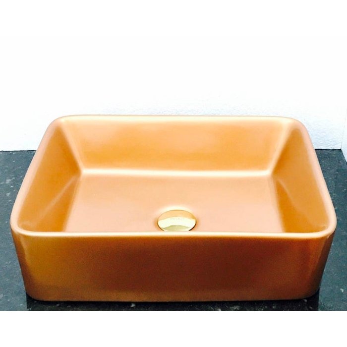 Dimensões: 48 x 37 x 13cm material: cerâmica. kit 2 peças com cuba de louça dourada cobre de sobrepor retangular, válvula click dourada para lavatórios