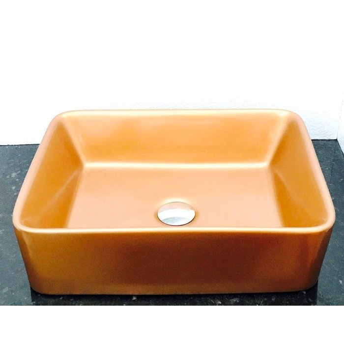 Dimensões: 48 x 37 x 13cm material: cerâmica. kit 3 peças com cuba de louça dourada cobre de sobrepor retangular, válvula click cromada para lavatórios e sifão cromado
