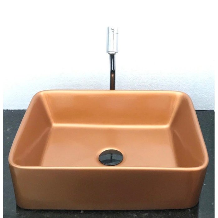 Dimensões: 48 x 37 x 13cm material: cerâmica. kit 3 peças com cuba de louça dourada cobre de sobrepor retangular, válvula click preta para lavatórios e torneira cromada 45