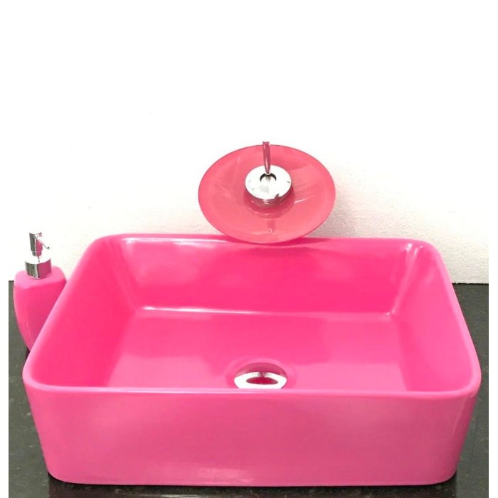 Dimensões: 48 x 37 x 13cm material: cerâmica. kit 5 peças com cuba de louça de sobrepor retangular, válvula click cromada, torneira cascata redonda de vidro temperado rosa, sifão cromado e saboneteira de porcelana rosa