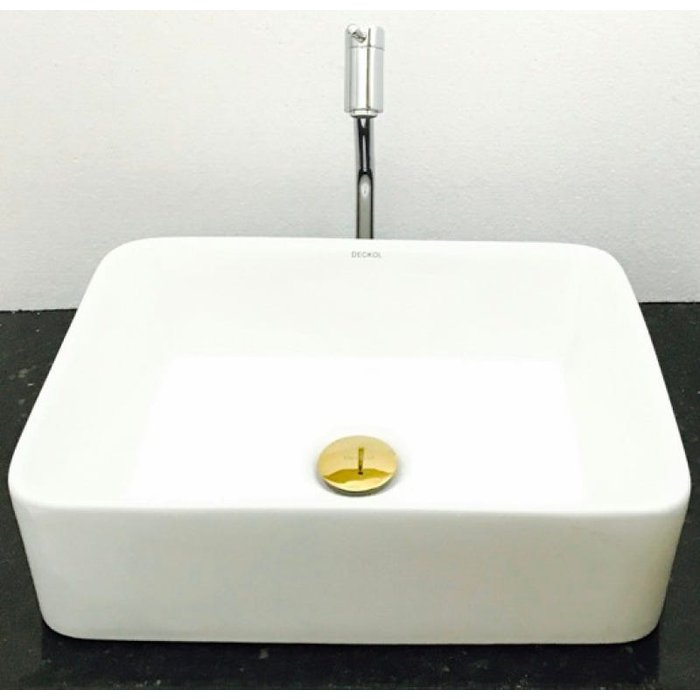 Dimensões: 48 x 37 x 13cm material: cerâmica. kit 3 peças com cuba de louça de sobrepor retangular, válvula click dourada para lavatórios e torneira cromada 45