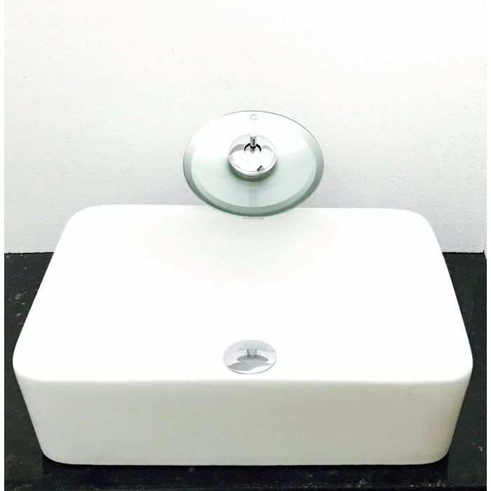 Dimensões: 48 x 37 x 13cm material: cerâmica. kit 3 peças com cuba de louça de sobrepor retangular, válvula click cromada pra lavatórios e torneira cascata redonda de vidro temperado prateada