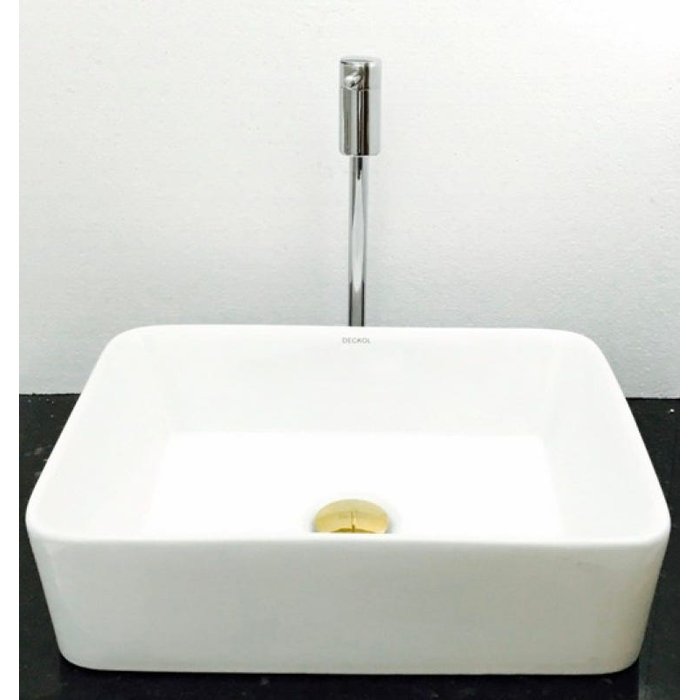 Dimensões: 48 x 37 x 13cm material: cerâmica. kit 4 peças com cuba de louça de sobrepor retangular, válvula click dourada para lavatórios, torneira cromada 90 e sifão cromado