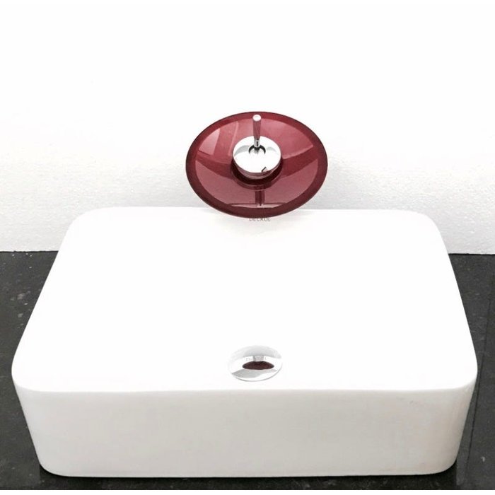 Dimensões: 48 x 37 x 13cm material: cerâmica. kit 3 peças com cuba de louça de sobrepor retangular, válvula click cromada para lavatórios e torneira cascata redonda de vidro temperado vermelha