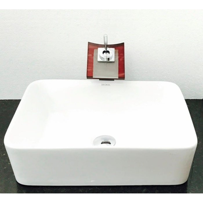 Dimensões: 48 x 37 x 13cm material: cerâmica. kit 3 peças com cuba de louça de sobrepor retangular, válvula click cromada para lavatórios e torneira cascata quadrada vermelha de vidro temperado