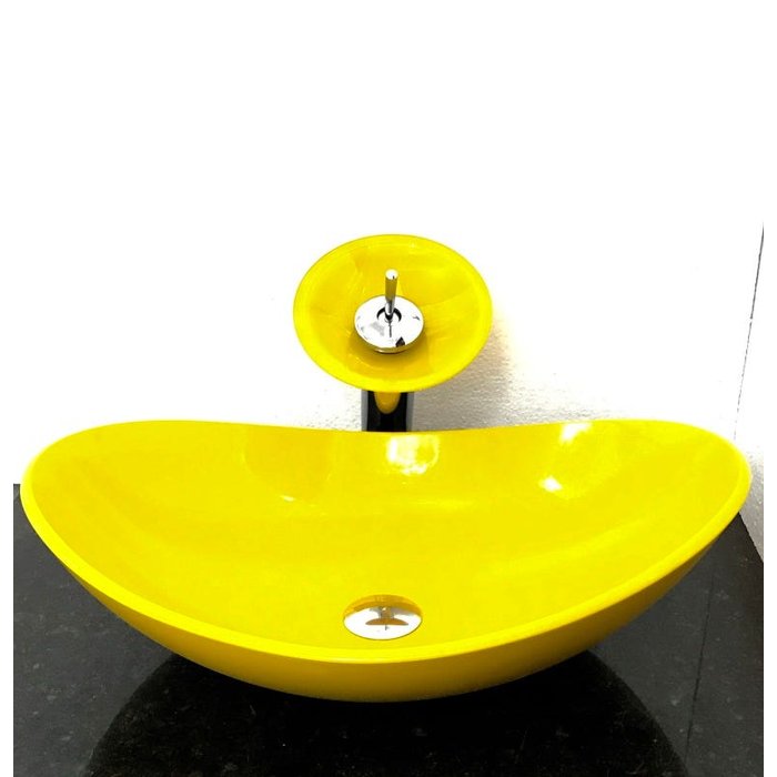 Kit com cuba vidro oval amarela,válvula e torneira cascata