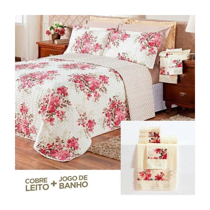 A Dourados Enxovais atribuiu em uma linha muita beleza, conforto, sofisticação e glamour, afim de proporcionar ao seu quarto um ambiente com muito requinte e bom gosto. A linha 150 Fios têm estampas luxuosas por fora e muito resistente por dentro, com fio calandrado e fácil de passar. Enquanto as estampas por si só, esbanjam beleza, também despertam atenções ao tornar o espaço mais aconchegante. O Cobre Leito permite não só o conforto, mas também traz qualidade e maciez no toque, até mesmo nos momentos de sono das pessoas que você ama, além de deixar sua cama elegante durante todo o dia. Acompanhando também esse belíssimo Jogo de Banho, com ele você leva para seu banheiro muito mais qualidade e conforto, além de um toque de beleza e elegância à decoração do ambiente. As toalhas são confeccionadas em 100% algodão. Tem ótimo toque e absorção. O que as torna uma excelente opção para o dia-a-dia e para presentear. 01 Cobre Leito 2,40m x 2,15m 02 Porta Travesseiros 70cm x 50cm 02 Toalhas de Banho 70cm X 1,25m 03 Toalhas de Rosto 70cm X 50cm Composição Cobre Leito: Tecido: 150 Fios 80% Algodão | 20% Poliéster Enchimento: Manta 60gr em 100% poliéster Composição Jogo de Banho: 100% ALGODÃO Gramatura: 285 Gramas Instruções de lavagem: Nas primeiras lavagens, não as misture com peças de outras cores; Enxágüe as peças de forma a retirar todo o sabão; Em casos de felpa puxada, o ideal é cortá-la com tesoura; Em caso de manchas pequenas, experimente detergente neutro ou sabão de coco; Não dobrar quando úmidas, mantenha-as abertas para evitar a proliferação de fungos e bactérias; Temperatura máxima 40°c; Não usar alvejante; Não é permitida a secagem em máquina de secar; Não lavar em máquina de lavar roupas; Atenção: Foto ilustrativa. Variação das cores podem ocorrer de acordo com o monitor.