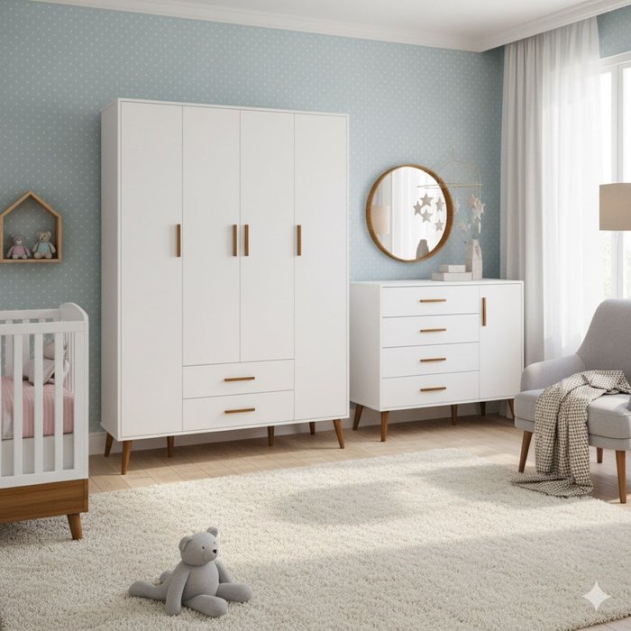 Apresentamos o Guarda Roupa Isis 4 Portas 2 Gavetas, fabricado pela Reller Móveis Infantis, possui um encantador toque retrô com pés em madeira que adicionam um design refinado e elegante ao quarto do seu bebê.