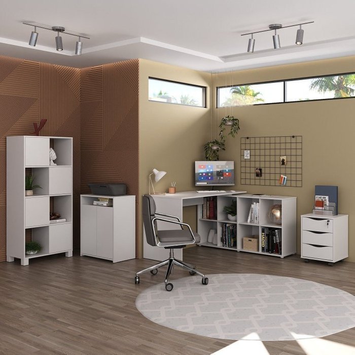 Kit Completo 4 Itens com Escrivaninha em L, Gaveteiro, Estante e Armário Multiuso Baixo Branco