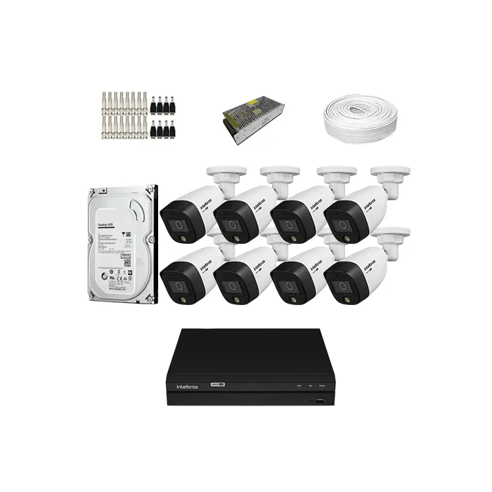 Kit 8 Câmeras Intelbras VHD 1220 B Full Color + DVR 4 Canais MHDX 1208 Full HD Lite + Acessorios + HD (disco rígido)Com o KIT 8 Câmeras de segurança Intelbras VHD 1220 B Full color, você consegue monitorar qualquer ambiente, em até 20 metros de total escuridão, tendo imagens coloridas e nítidas com a resolução Full HD 1080p . As Câmeras VHD 1220 B Full Color, possuem o Grau de proteção IP67, contra Sol, Chuva e Poeira, podendo ser instalada tanto em ambientes internos quanto externos. Para gravação, o KIT Acompanha o DVR Intelbras MHDX 1208, com capacidade de até 8 Câmeras em Resolução Full HD Lite. O Kit também acompanha o HD (Disco rígido) Selecionável no campo armazenamento, cabo para instalação e todos os conectores necessários.