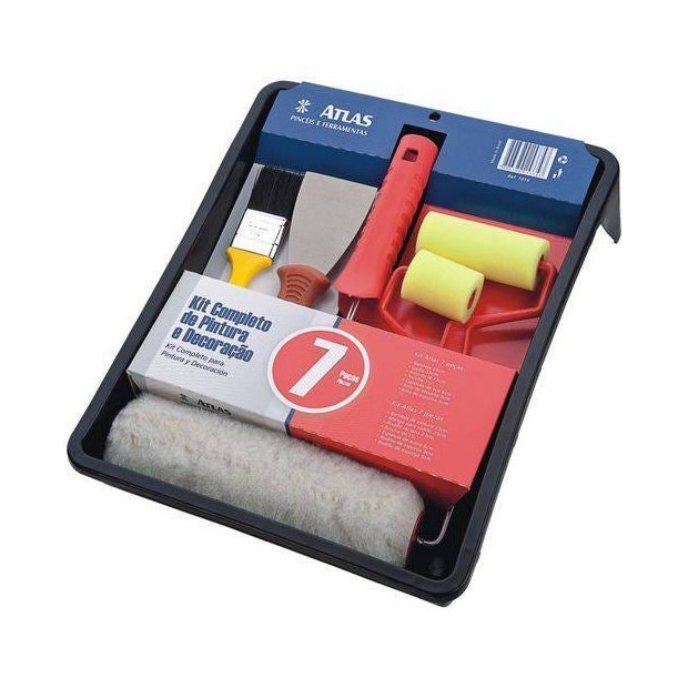<p >Kit 7 peças com bandeja, trincha 1 1/2 cerda preta, espátula 6cm, rolos de espuma de 5 e 9cm, garfo e rolo de lã de poliéster de alta densidade de 23cm.</p>