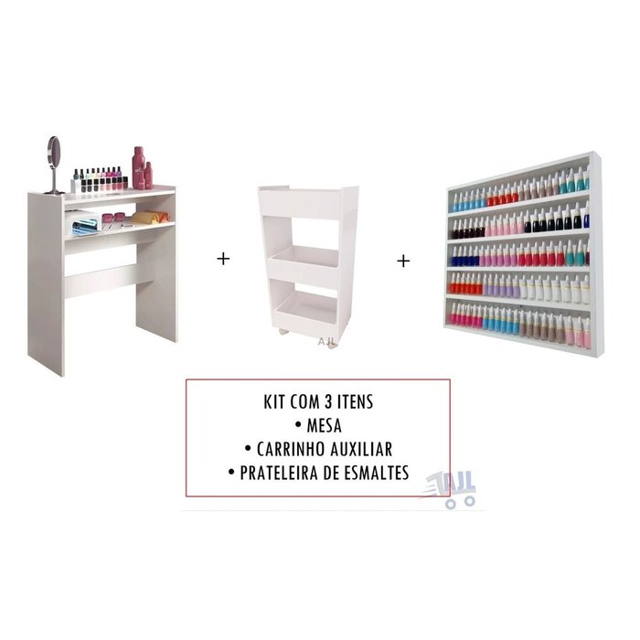 KIT 3 ITENS: Mesa + Carrinho Auxiliar + Prateleira Expositora de Esmaltes