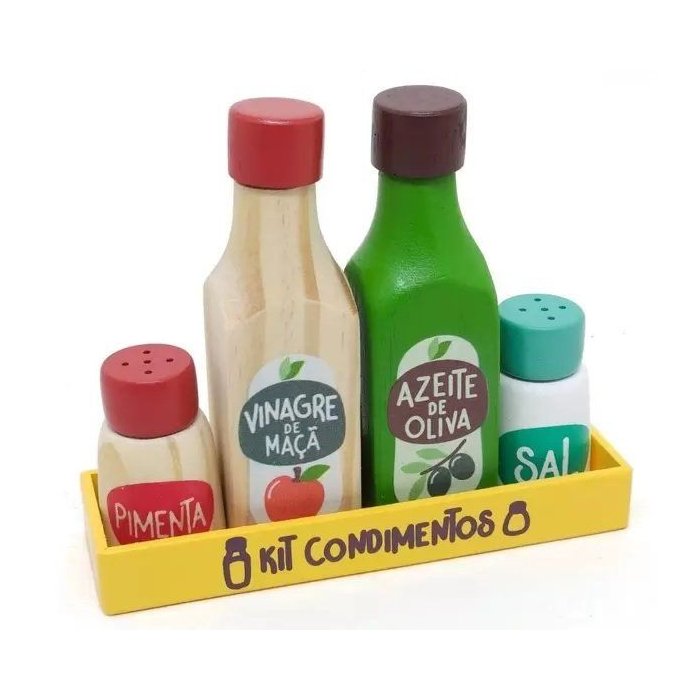 Brinquedo Kit Condimentos em Madeira 3+ A coleção Brincando de Comidinha apresenta uma variedade de miniaturas, que levam a imaginação das crianças para um mundo de f de conta, onde elas vivenciam situações do seu cotidiano de maneira lúdica e criativa.