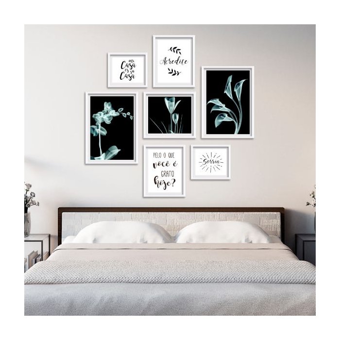 Kit composto por 7 quadros 2 de 45x33cm 2 de 33x24cm 1 de 33x33cm e 2 de 24x24cm.