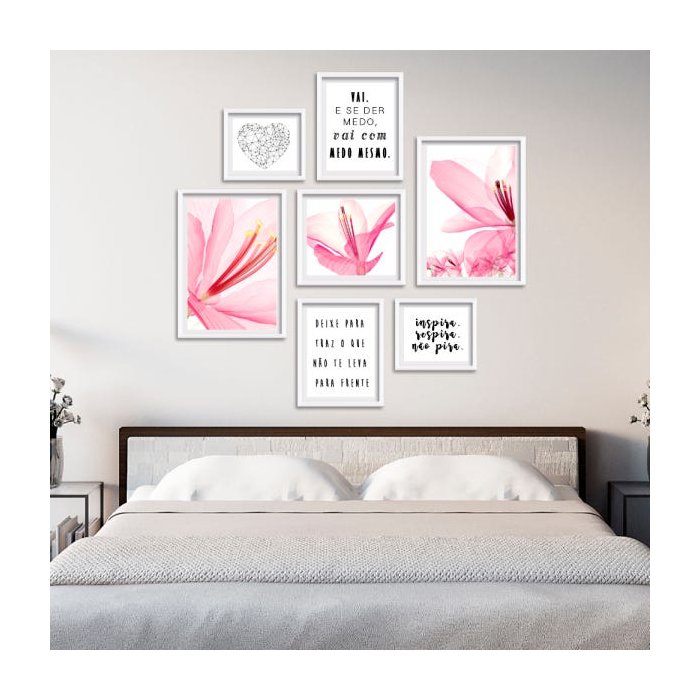 Kit Conjunto 7 Quadros Flores Raiox Com Frases Vai Com Medo Mesmo Moldura Branca - Oppen House Quadr
