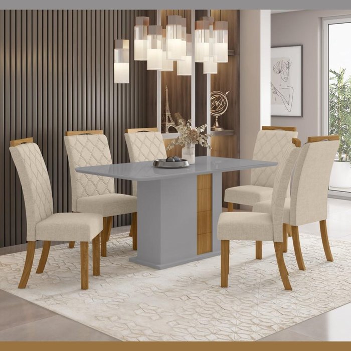Kit Conjunto Mesa Bruna 160 cm Cinza 6 Cadeiras Sala de Jantar Cozinha MDF Madeira Cinza Bege Claro