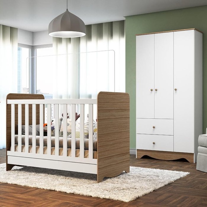 Seu desejo por montar o quartinho dos sonhos do seu bebê já pode se tornar realidade! Essa proposta da Móveis Peroba é muito encantadora além de todo custo benefício. São produtos desenvolvidos em 100% MDF, acabamento em pintura UV, bordas laqueadas e pintura atóxica. O guarda roupa possui corrediças telescópicas, que facilitam o deslize das gavetas, proporcionando maior durabilidade. O berço pode ser utilizado como Mini Sofá ou Mini Cama, prolongando o uso e acompanhando o desenvolvimento do seu bebê. Especificações Berço 3 em 1 - Comprimento: 132,4 cm - Largura: 76 cm - Altura: 66,6 a 97,4 cm - Não acompanha Colchão - 3 Opções de Montagem: Berço, Sofá ou Mini Cama - Suporte para Mosquiteiro - Altura do Estrado regulável Especificações Guarda Roupa - Comprimento: 92,9 cm - Largura: 42 cm - Altura: 194,5 cm - 3 Portas - 2 Gavetas - 3 Prateleiras - Com cabideiro - Cor: Branco Brilho/Carvalho - As configurações do seu monitor ou dispositivo móvel podem afetar a tonalidade da cor do produto. Conferir na descrição. - Recomendação de Limpeza: Limpar com pano seco para retirar o pó. Não aplicar produtos abrasivos. - Produtos de Enfeite e Eletrônicos Não Estão Inclusos.