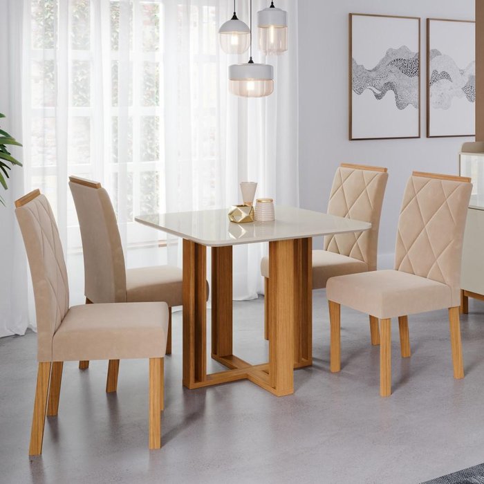 Kit Conjunto Sala De Jantar Mesa Quadrada 94 Cm Com 4 Cadeiras Tampo MDF Marrom Madeira Off White