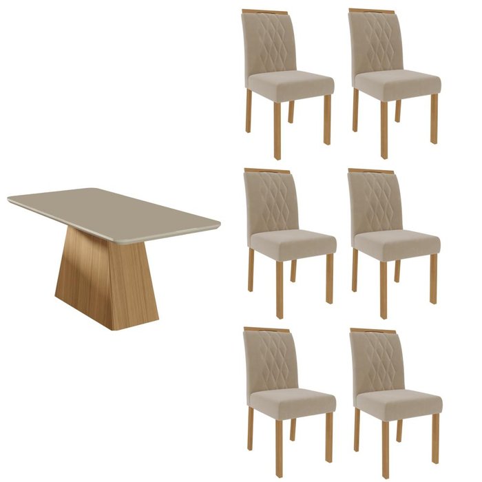 Kit Conjunto Sala De Jantar Mesa Tampo MDF Vidro 180 Cm Com 6 Cadeiras Marrom Madeira Off White Bege
