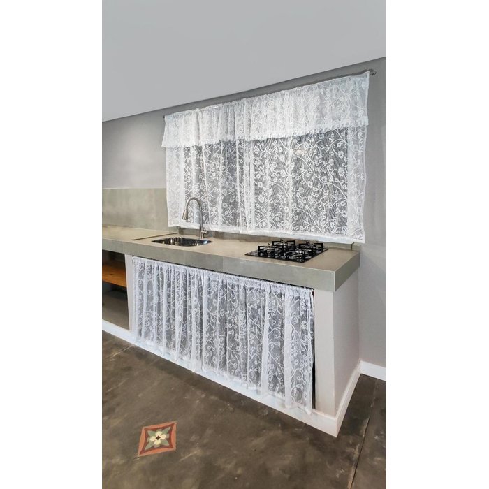 Jogo de Cortina para pia de renda vazada com relevo em galhos branca.