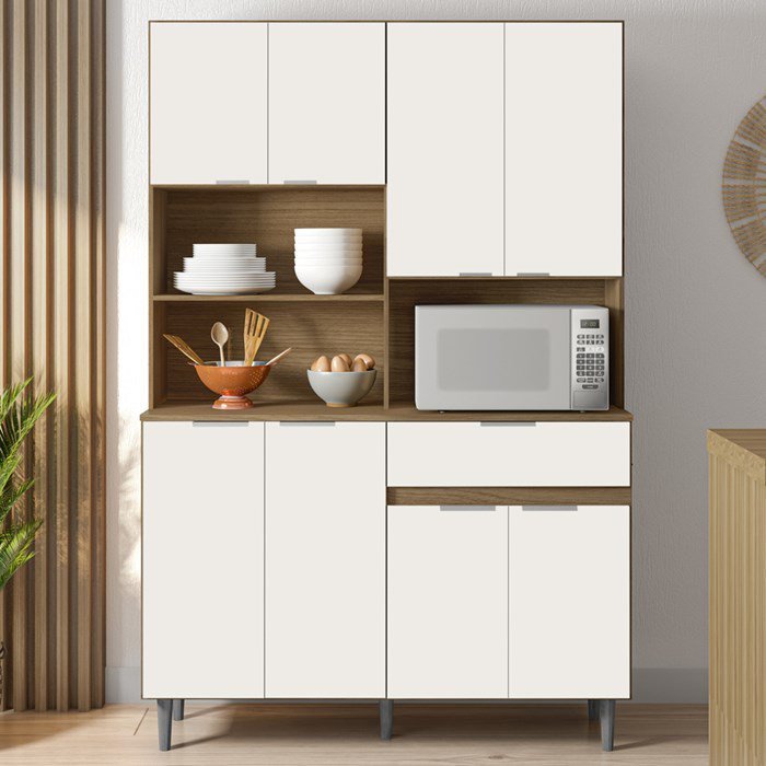 Kit Cozinha Laila destaca-se por sua praticidade e eficiência de uso. Estrutura em 100% MDF de 12/15mm garantindo maior resistência, acabamento em pintura UV. Composta por 8 portas com dobradiças metálicas, 01 gaveta com corrediças telescópicas permitindo a abertura total, puxadores em polímero na cor prata fosco, nichos decorativos, espaço para microondas, amplo espaço interno com prateleira, acompanha pés fixos na cor cinza em PVC de 14cm. O acabamento Perffect Touch possui maior resistência e conta com proteção Bacterban que inibe a proliferação de fungos e bactérias na superfície do móvel. Produto ecologicamente correto com embalagens preparadas para que o produto chegue em perfeito estado em sua casa. Este móvel chegará em sua casa separado em 2 volumes.