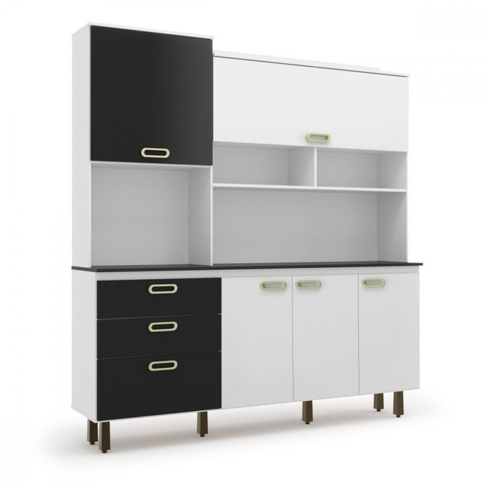 Esse modelo é composto por armários e gavetas que oferecem espaço suficiente para armazenar utensílios de cozinha e eletrodomésticos.