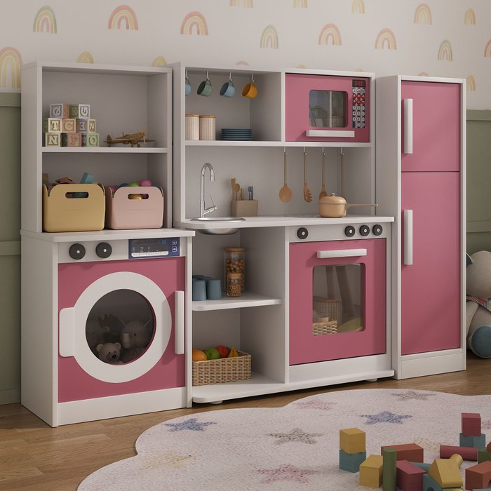 Com um design moderno e detalhes encantadores, o brinquedo conta com fogão, pia, armário, geladeira e até uma máquina de lavar roupas – tudo para criar um ambiente interativo onde os pequenos podem brincar de cozinhar, organizar e cuidar da casinha como gente grande!