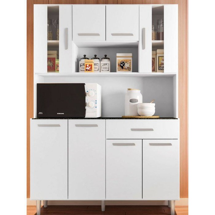 O Kit Cozinha Gabi é ideal para quem deseja praticidade e funcionalidade em qualquer ambiente. Com design compacto e uma excelente disposição interna, traz na sua composição 08 portas sendo 02 com vidro, 01 gaveta com corrediça metálica deslizante, espaço para micro-ondas ou demais aparelhos de utilidade doméstica, prateleiras e nicho organizador decorativo dando um charme especial à peça. Produto com pés reguláveis fabricado em Mdp que garante a qualidade que só a Poliman oferece em seus produtos.