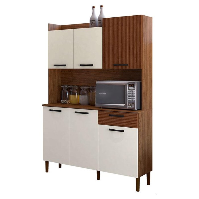Kit Cozinha Gênova 6 Portas Nogueira Off White Ripado - Kits Paraná Nogueira Off White Ripado