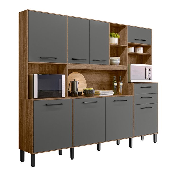 Possui 8 portas e 2 gavetas, espaço para Microondas e Forno, ideal para amplos espaços, possui bons compartimentos para acomodar panelas, travessas e produtos essenciais do dia-a-dia. Com sua estrutura em MDP trará mais durabilidade ao produto.