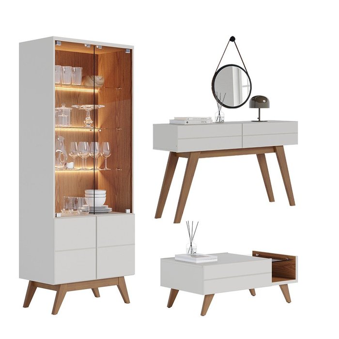 Kit Cristaleira Aparador Mesa de Centro Rebeca e Espelho Adnet 67cm C05 Off White/Freijó - Mpozenato
