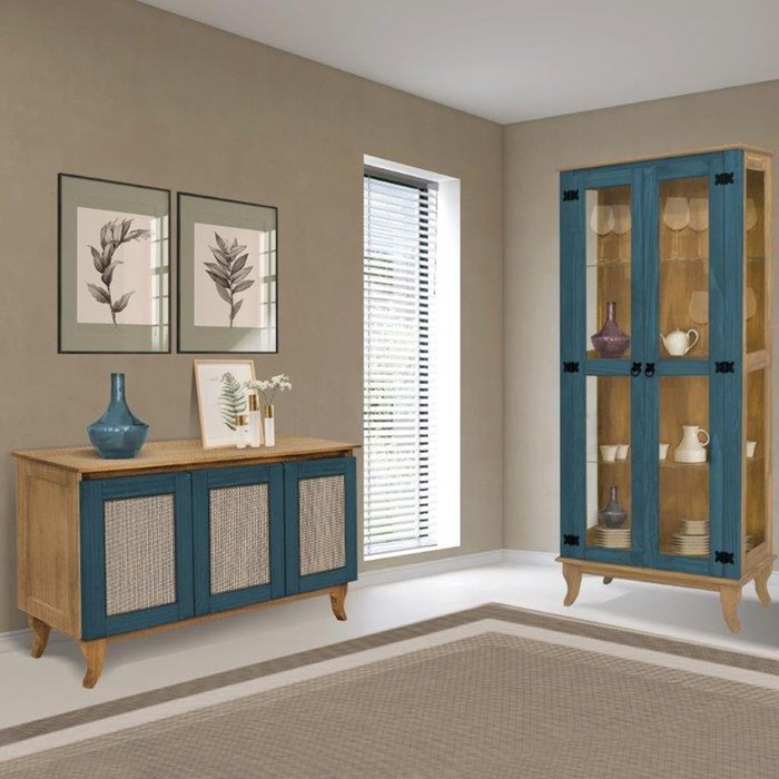 Kit Cristaleira de Vidro e Buffet Aparador Telinha 3 Portas em Madeira Maciça Azul/imbuia