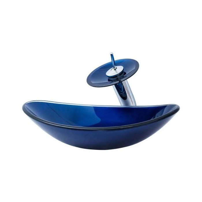 Kit: Cuba de Vidro Oval + Torneira Cascata + Válvula Click - Azul Escuro