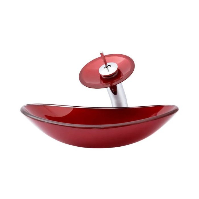 Kit: Cuba de Vidro Oval + Torneira Cascata + Válvula Click - Vermelho Escuro