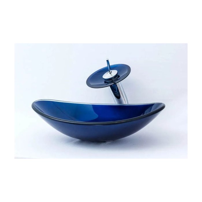 Kit: Cuba de Vidro Oval + Torneira Cascata + Válvula + Sifão - Azul Escuro