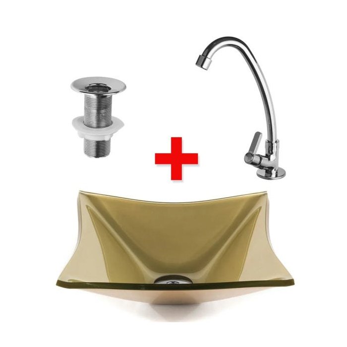 Kit: Cuba de Vidro Quadrada RT 30 + Torneira M20 + Válvula - DOURADO