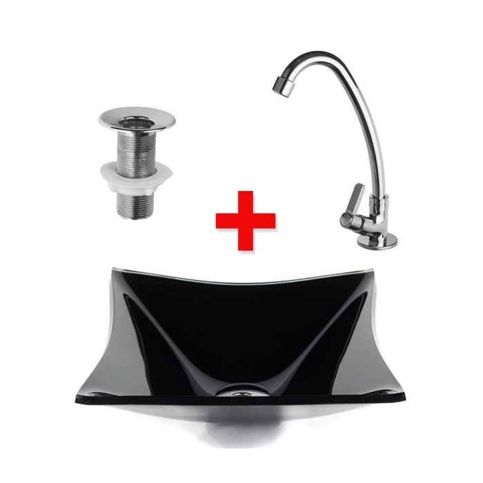 Kit: Cuba de Vidro Quadrada RT 30 + Torneira M20 + Válvula - Preto