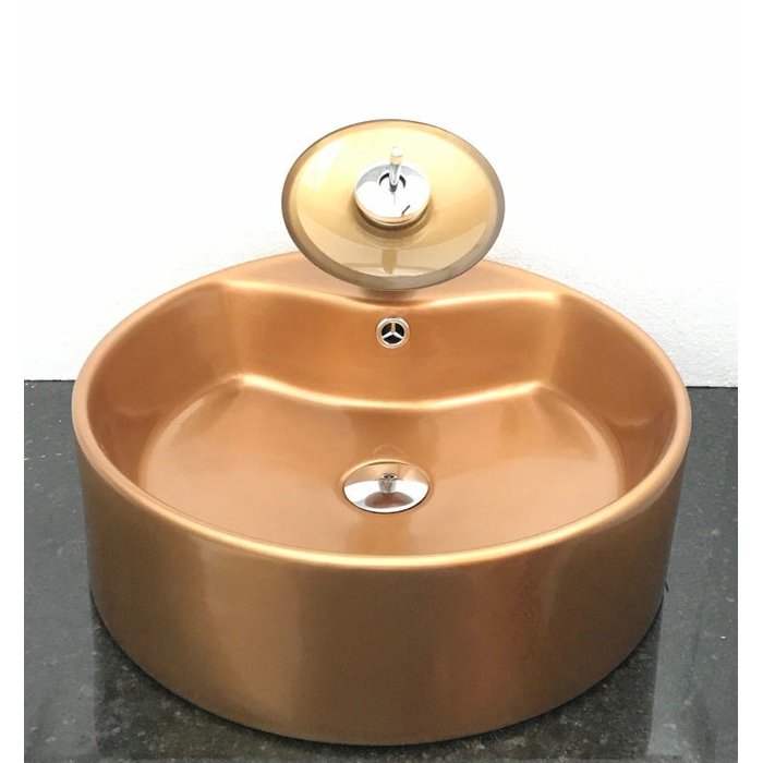 Dimensões: 46,5 x 17cm material: cerâmica. kit 4 peças com cuba de louça dourada cobre redonda de sobrepor com apoio para torneira, válvula click cromada para lavatórios, torneira cascata redonda de vidro temperado dourado e sifão cromado