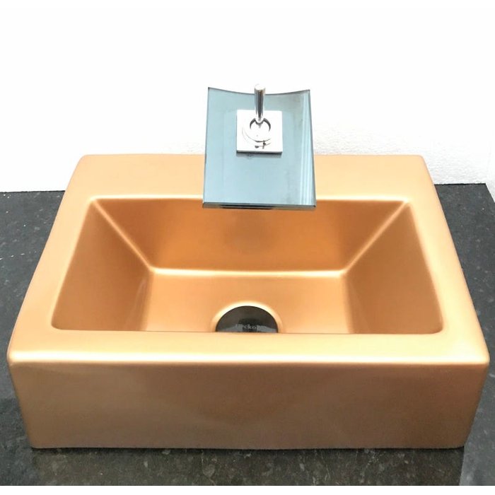 Dimensões: 42,5 x 30 x 13cm material: cerâmica. kit 4 peças com cuba de louça dourada cobre retangular com apoio para torneira, válvula click preta para lavatórios, torneira cascata quadrada de vidro temperado fumê e sifão cromado