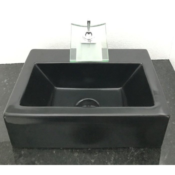 Dimensões: 42,5 x 30 x 13cm material: cerâmica. kit 4 peças com cuba de louça preta retangular com apoio para torneira, válvula click preta para lavatórios, torneira cascata quadrada de vidro temperado e sifão cromado