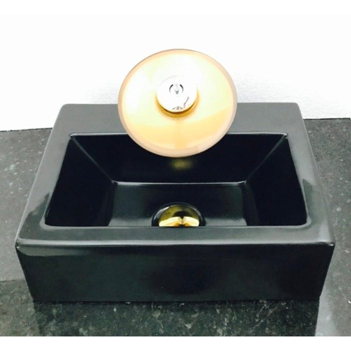 Dimensões: 42,5 x 30 x 13cm material: cerâmica. kit 3 peças com cuba de louça preta retangular com apoio para torneira, válvula click dourada para lavatórios e torneira cascata redonda de vidro temperado dourado
