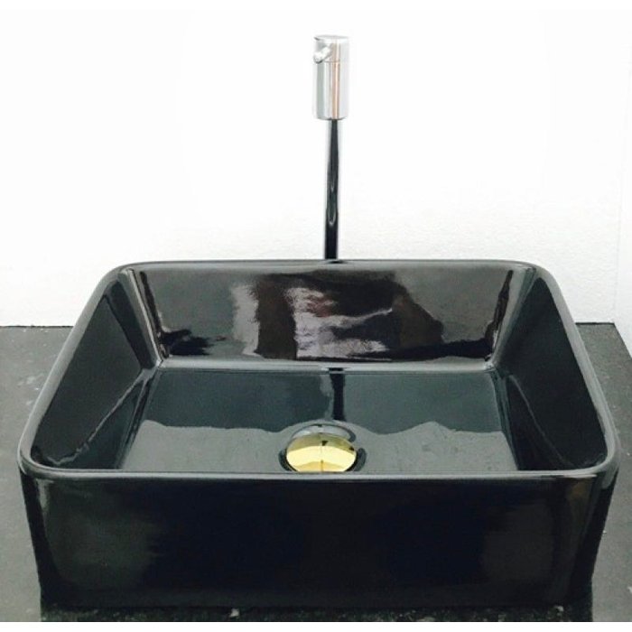 Dimensões: 48 x 37 x 13cm material: cerâmica. kit 3 peças com cuba de louça preta de sobrepor retangular, válvula click dourada para lavatórios e torneira cromada 90