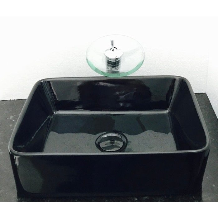 Dimensões: 48 x 37 x 13cm material: cerâmica. kit 4 peças com cuba de louça preta de sobrepor retangular, válvula click preta para lavatórios, torneira cascata redonda de vidro temperado e sifão cromado