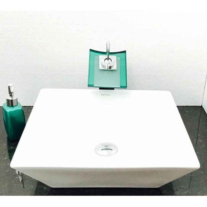 Dimensões: 41 x 41 x 12cm material: cerâmica. kit 5 peças com cuba de louça de sobrepor quadrada, válvula click cromada, torneira cascata quadrada verde de vidro temperado, sifão cromado e saboneteira de porcelana verde