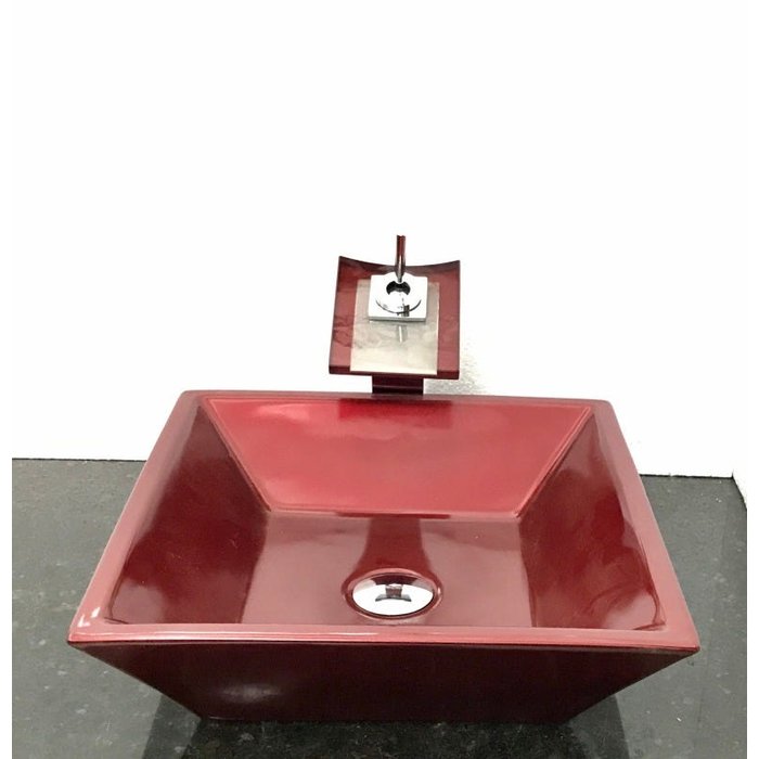 Dimensões: 41 x 41 x 12cm material: cerâmica. kit com cuba de louça de sobrepor quadrada, válvula click cromada para lavatórios, torneira cascata quadrada de vidro temperado vermelho vinho e sifão cromado