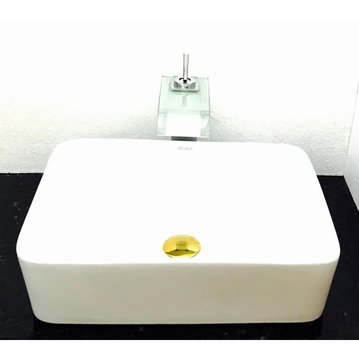 Dimensões: 48 x 37 x 13cm material: cerâmica. kit 4 peças com cuba de louça de sobrepor retangular, válvula click dourada para lavatórios, torneira bico de pato de vidro temperado e sifão cromado