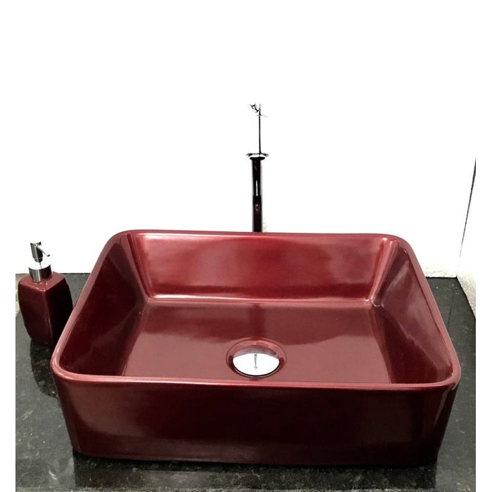 Dimensões: 48 x 37 x 13cm material: cerâmica. kit com cuba de louça de sobrepor retangular, válvula click cromada, torneira cromada 45, sifão cromado e saboneteira de porcelana vermelho vinho