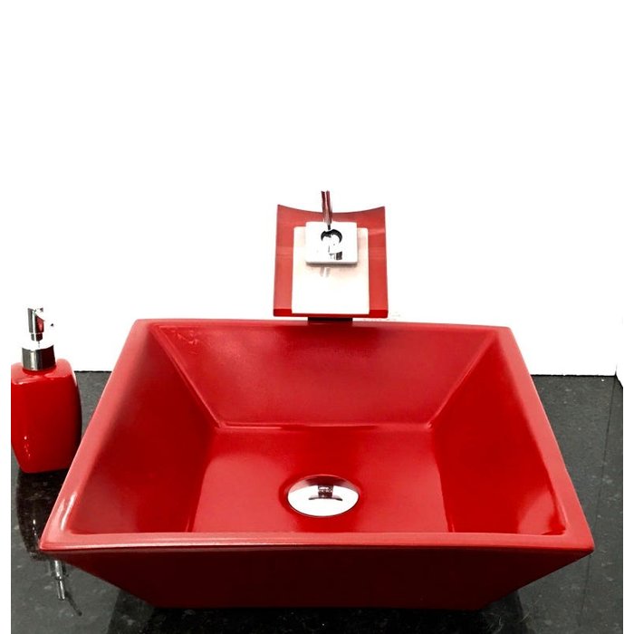 Dimensões: 41 x 41 x 12cm material: cerâmica. kit 5 peças com cuba de louça de sobrepor quadrada, válvula click cromada, torneira cascata quadrada de vidro temperado vermelho ferrari, sifão cromado e saboneteira de porcelana vermelha