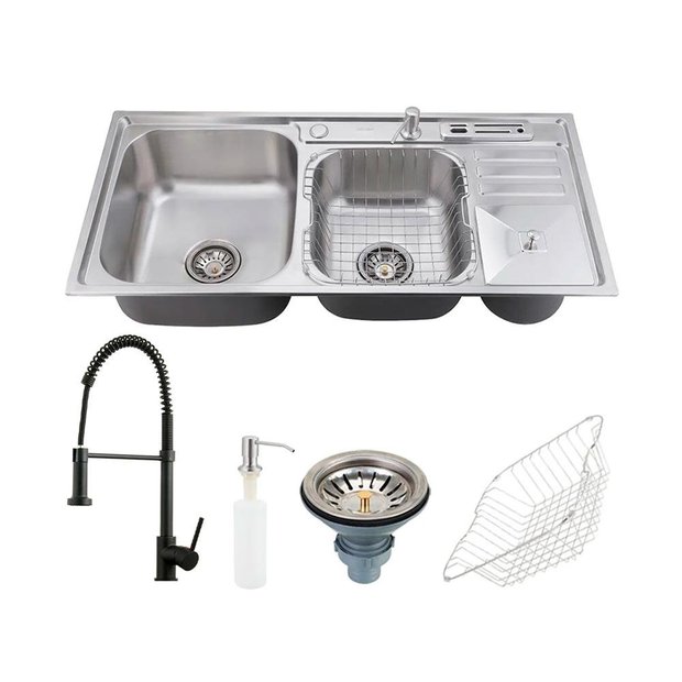 A Pingoo.casa está sempre inovando e trazendo as melhores opções de produtos para compor a decoração do seu lar. Pensamos nos detalhes com atenção, proporcionando assim não só um produto sofisticado, mas também com funcionamento exemplar que vem para facilitar o seu dia a dia.Desenvolvida para proporcionar praticidade e conforto ao lavar a louça, a cuba de pia dupla aço inox Caiapós conta com local para dosador de detergente e cesto, para aprimorar a organização da pia e praticidade na limpeza de alimentos e louças. Produzida em aço inox escovado e acetinado é resistente e fácil de limpar, garantindo alta resistência à oxidação e corrosão.Com a incomparável torneira gourmet misturador monocomando Envira você controla a vazão e mistura água quente com um único comando, o que pode ser útil em casas localizadas num clima mais ameno.Especificações cuba:Material predominante: aço inox 304Espessura: 0,8mmAcabamento: escovado e acetinadoPosição da válvula: centralizadaFuração da válvula: 4.1/2"Furo do dosador: 2,5 cm de diâmetroAntirruído: sim (fundo)Especificações torneira:Bica giratória: sim (360 graus)Arejador: simCartucho cerâmico: simInstalação: bancadaFuro da bancada: 3,5 cmConexão de entrada: 1/2"Itens inclusos:1 Cuba Caiapós1 Torneira Envira1 Par de flexíveis de aço trançado de 50 cmSistema de fixação1 Lixeira de 3 litros1 Cesto escorredor1 Dosador 300 ml2 Válvula de escoamento1 Kit acessórios de instalação1 Placa de reforço para torneiras