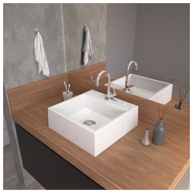 1 Cuba de Apoio, 1 Torneira de mesa baixa, 1 Válvula de Escoamento Clik Up, 1 Sifão PVC Universal Branco, 1 Engate Flexível 40cm